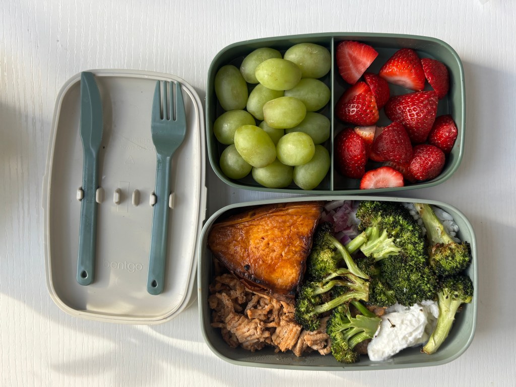 Bento boxes are the best! Easy to squeeze into a usually-very-full unit fridge.