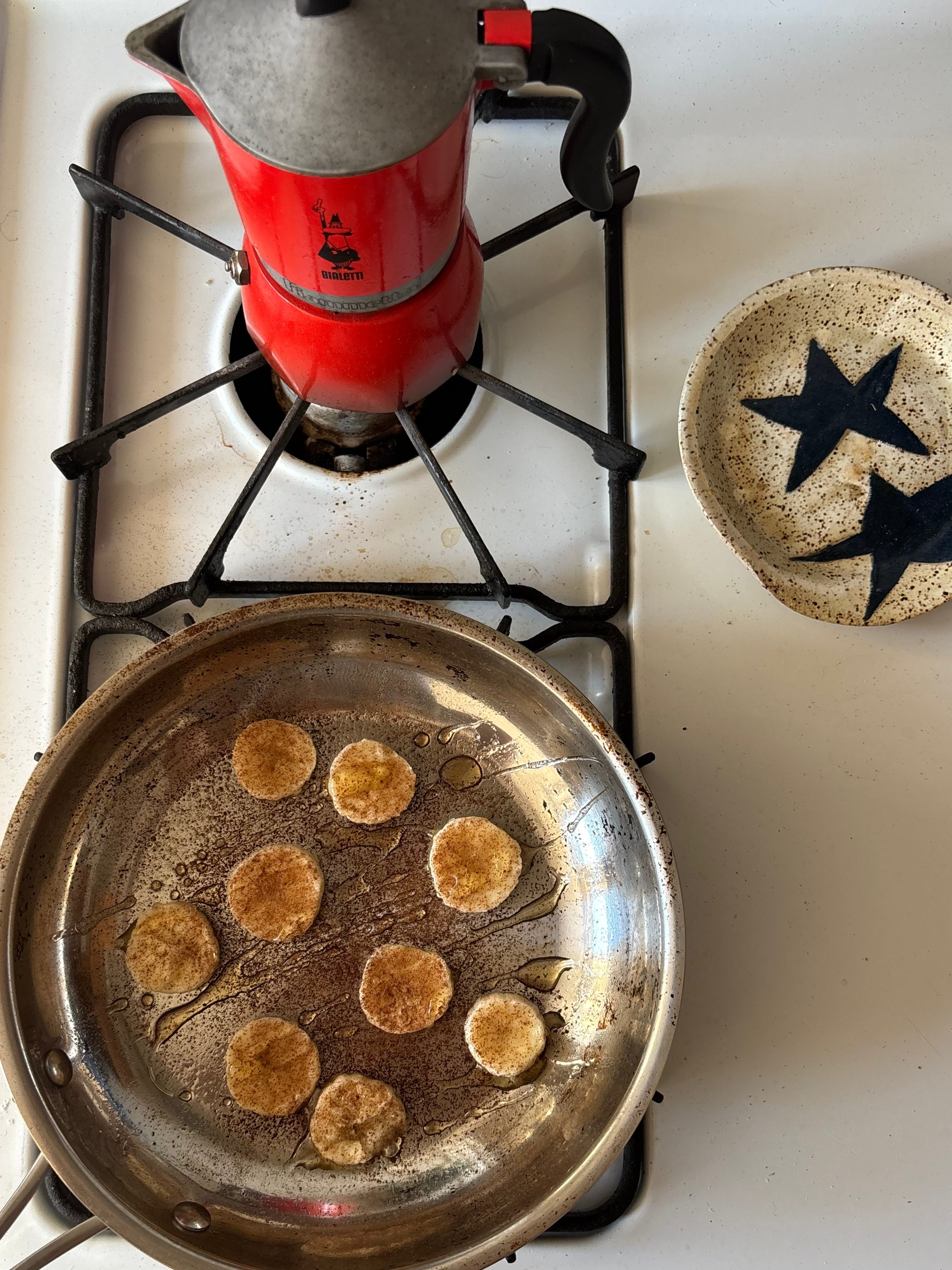 Heat a small pan over low. Add oil, then banana slices, cinnamon, and honey. Cook for 1–2 minutes per side until warm, caramelized, and very comforting.